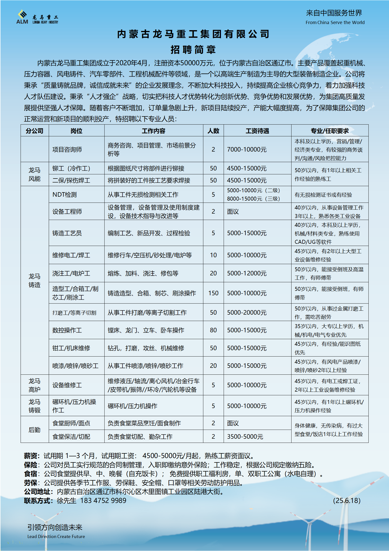 內(nèi)蒙古龍馬重工集團有限公司招聘簡章 發(fā)布時間:2025-06-26 返回 上一篇:自治區(qū)發(fā)改委調(diào)研組蒞臨蒙東(通遼)風電裝備制造產(chǎn)業(yè)基地調(diào)研上一篇:銘記光輝歷程 汲取奮進力量 | 龍馬重工集團隆重舉行慶祝中國共產(chǎn)黨成立104周年主題活動